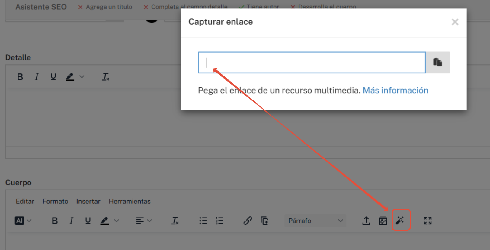 - Vuelve a tu sitio y pega el enlace (CTRL+V) en el campo del capturador de enlaces