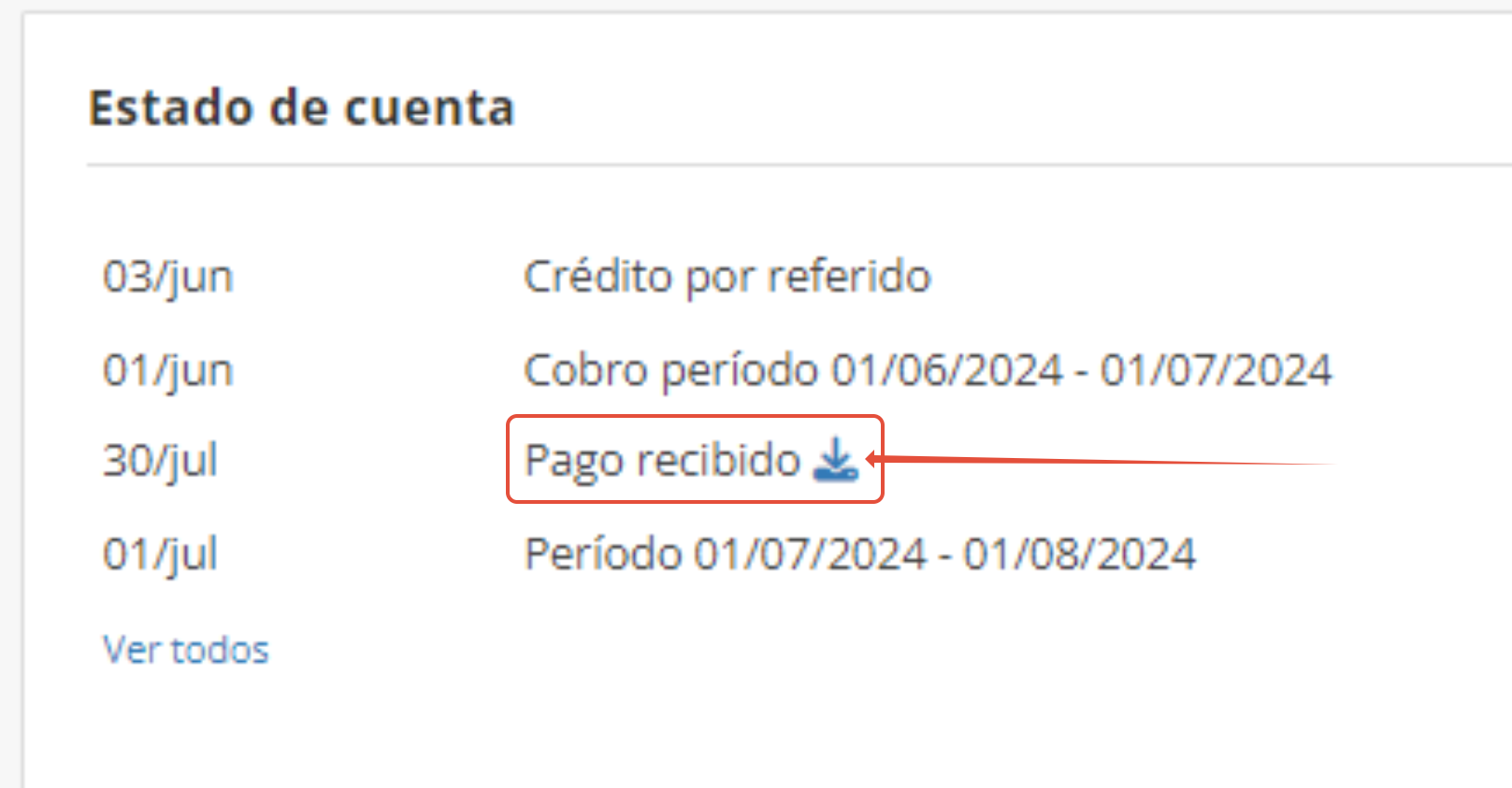 - Desde el Panel: En la sección Estado de cuenta, haz clic en el ícono de descarga junto a cada pago recibido. Para ver el historial completo, selecciona Ver todos los movimientos.