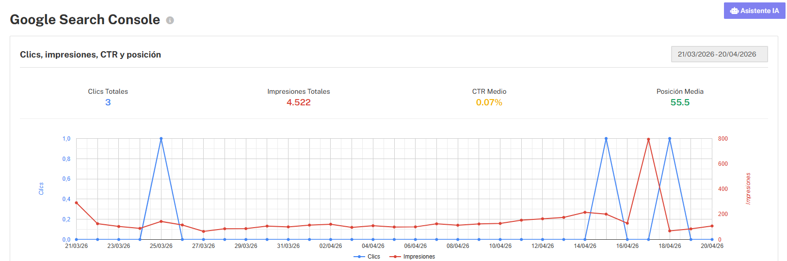 Umbral de visibilidad: Si tu sitio es nuevo o aún no tiene posicionamiento activo en Google, el panel no mostrará datos. Google Search Console solo reporta cuando hay actividad real en el buscador.