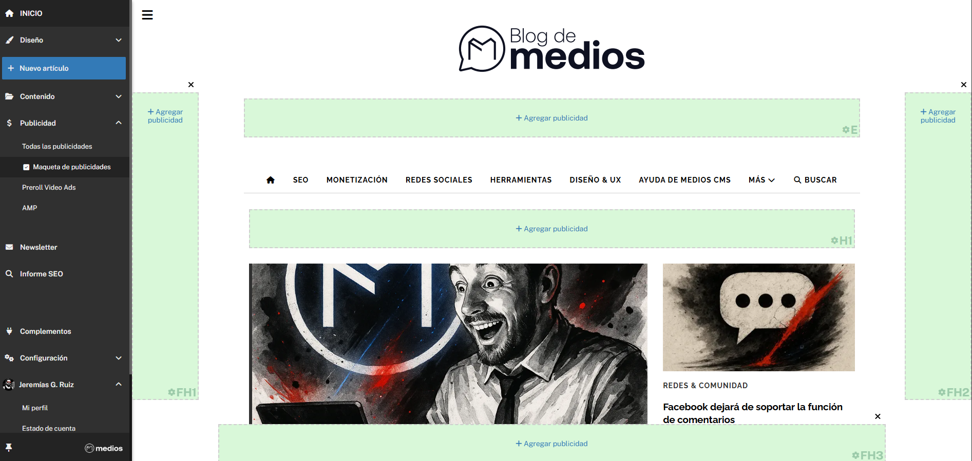 - Activa la Maqueta: En el panel lateral, despliega las opciones de Publicidades y enciende la "Maqueta de Publicidades" para ver los espacios disponibles en verde. Recuerda que si estás en la portada verás los espacios dedicados a la portada. Si ingresas a un artículo cualquiera y activas la maqueta de publicidades, entonces verás los espacios dedicados exclusivamente a artículos.