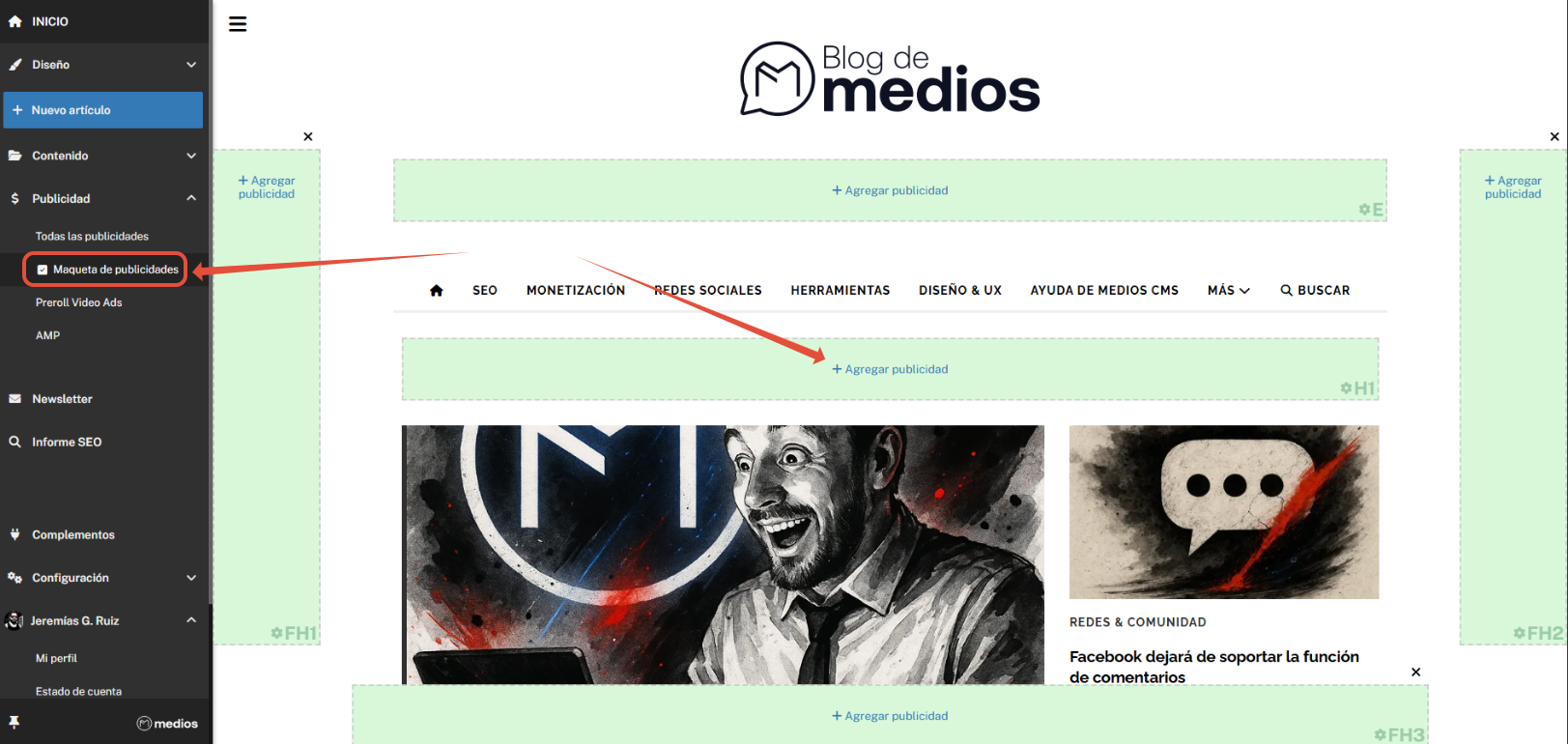 Ve a Publicidades y activa la Maqueta de publicidades. Verás que en tu sitio aparecen espacios de color verde identificando todos los lugares donde puedes cargar anuncios.
