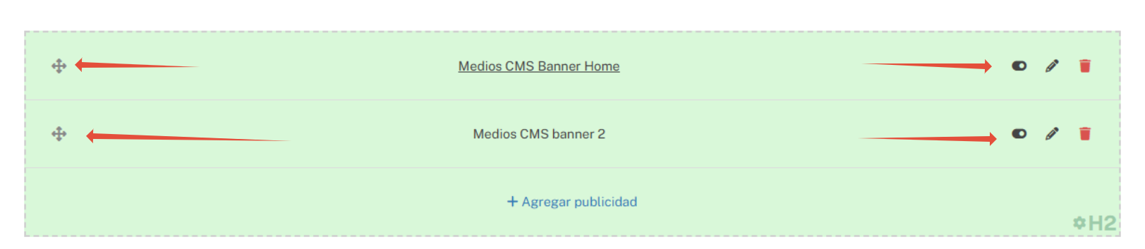 - Carga un nuevo anuncio y repite estos pasos todas las veces que necesites. Cada anuncio se mostrará dentro de un bloque de color y tendrá sus controles de mover, on/off, editar y eliminar.