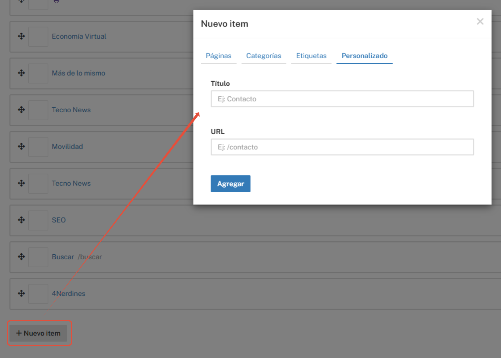 - Agregar ítems: Utiliza el botón "Nuevo ítem". En la ventana emergente, selecciona el elemento que desees (una página, una categoría, una etiqueta específica o un botón personalizado).