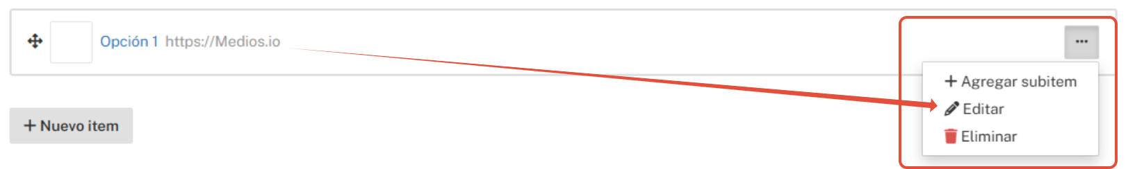 - Crear submenús: Para organizar secciones dentro de otras (menús desplegables), utiliza el botón "Nuevo subítem" dentro de la opción principal correspondiente.