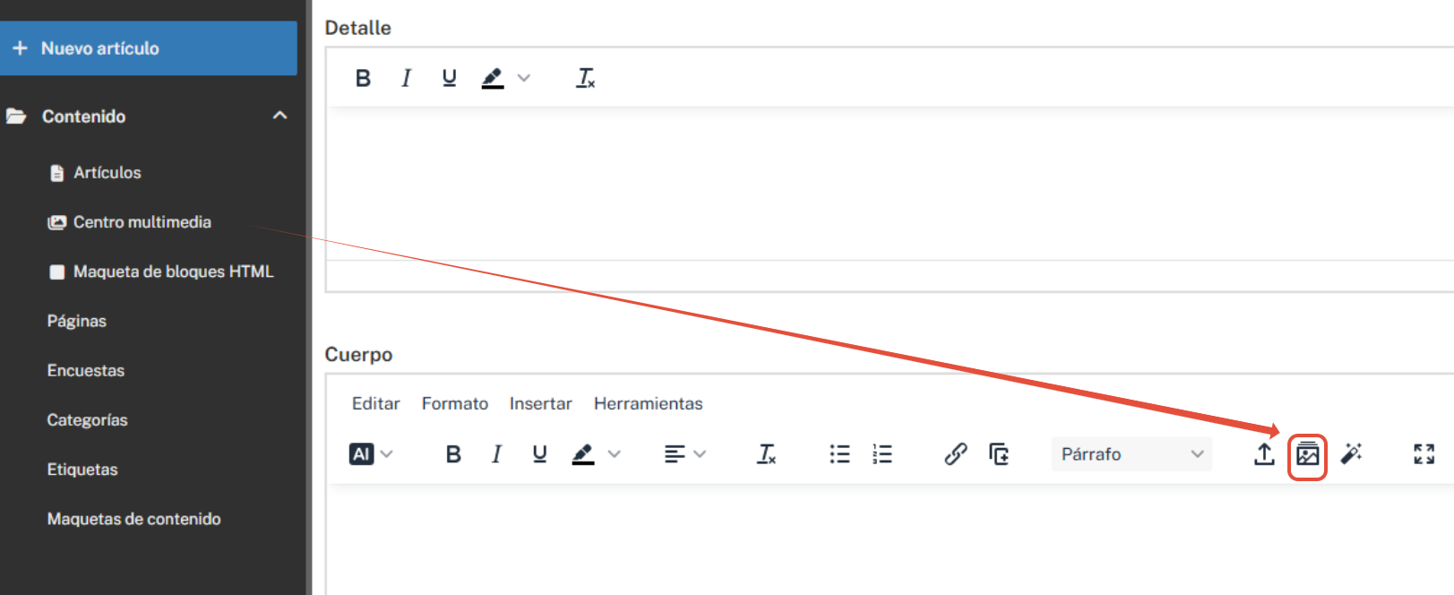 El Centro Multimedia puede ser invocado desde otros varios espacios, por ejemplo, durante la redacción de un artículo, encuesta, video, galería, publicidad u otro contenido.