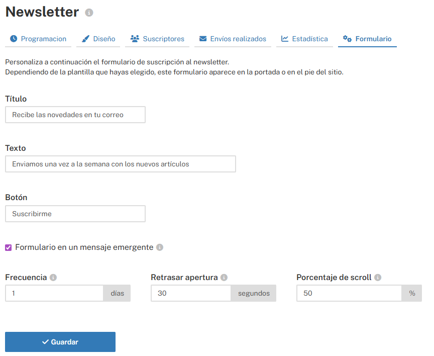 - Frecuencia: Es la frecuencia en que el formulario emergente se mostrará a un mismo visitante.