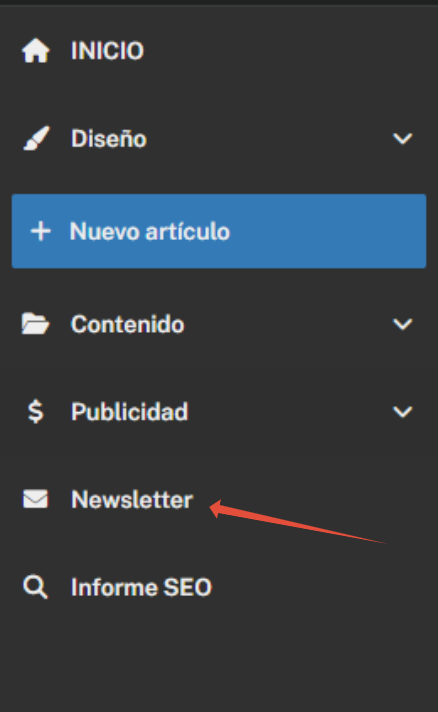 Una vez activado, aparecerá el acceso directo Newsletter en tu panel lateral con las siguientes secciones.