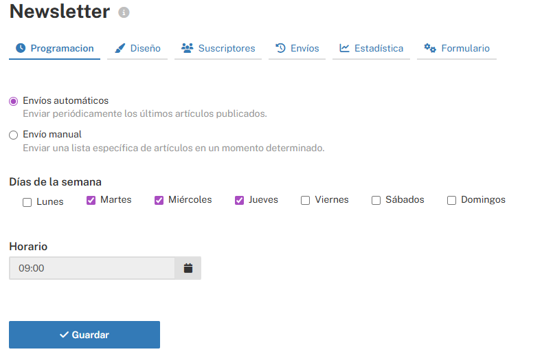 Configura envíos automáticos o manuales- Envíos automáticos: Selecciona los días de la semana y el horario en que quieres que se envíe el Newsletter. Se incluirán los últimos 10 artículos encontrados antes de la hora de envío. Guarda los cambios para activar el envío.