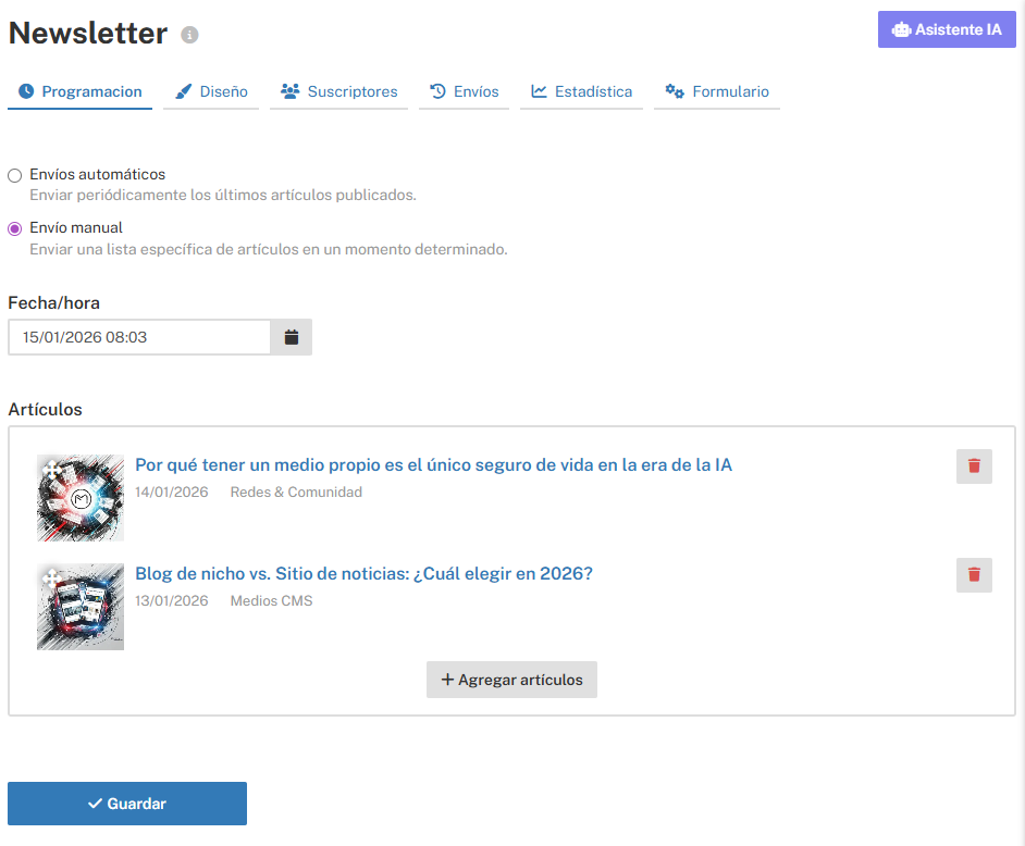 - Envíos manuales: Define una fecha y hora del envío, y selecciona los artículos a enviar. Guarda los cambios para dejar programado el envío.