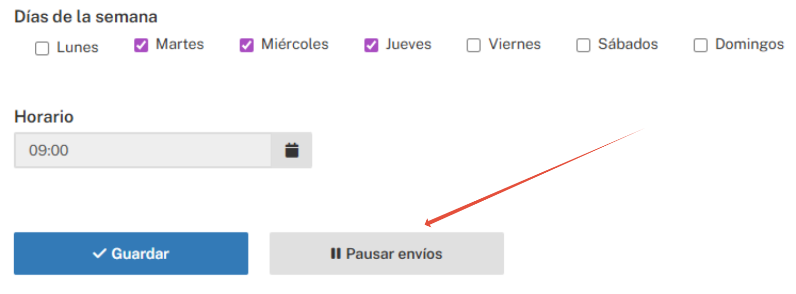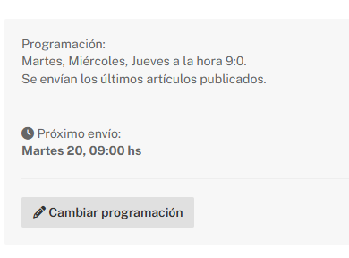- Detener el envío: Una vez guardado los cambios el Newsletter quedará programado según tu configuración. Si deseas detener el envío, sea manual o automático, usa el botón de Cambiar programación y luego Pausar envíos.