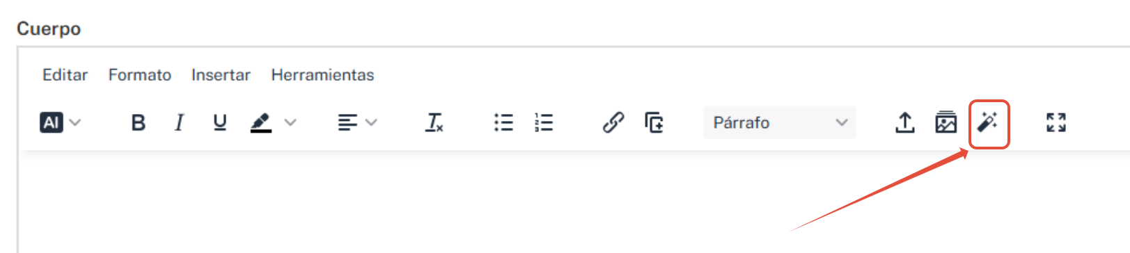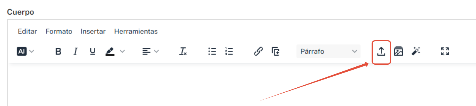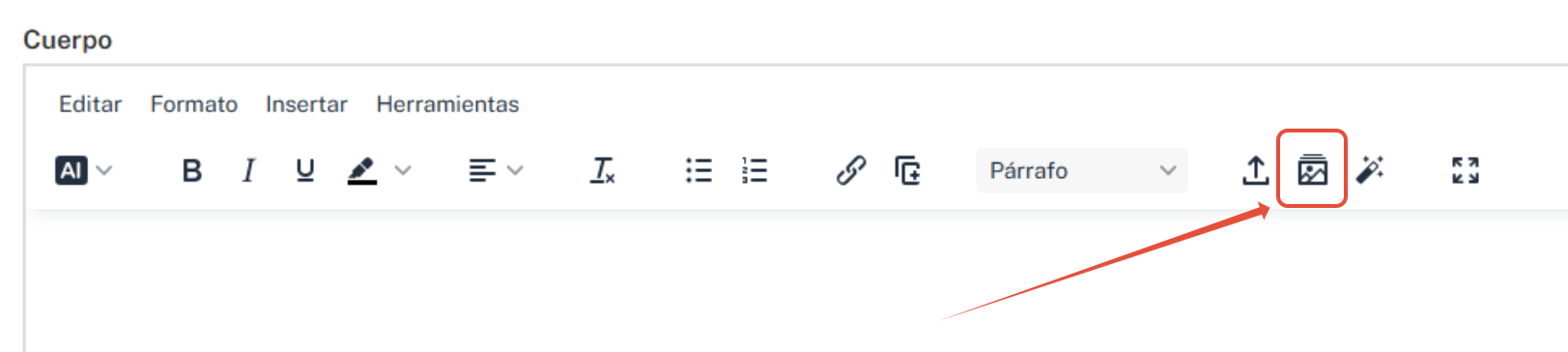 - Ubica el cursor en la posición del cuerpo del artículo donde deseas agregar un elemento