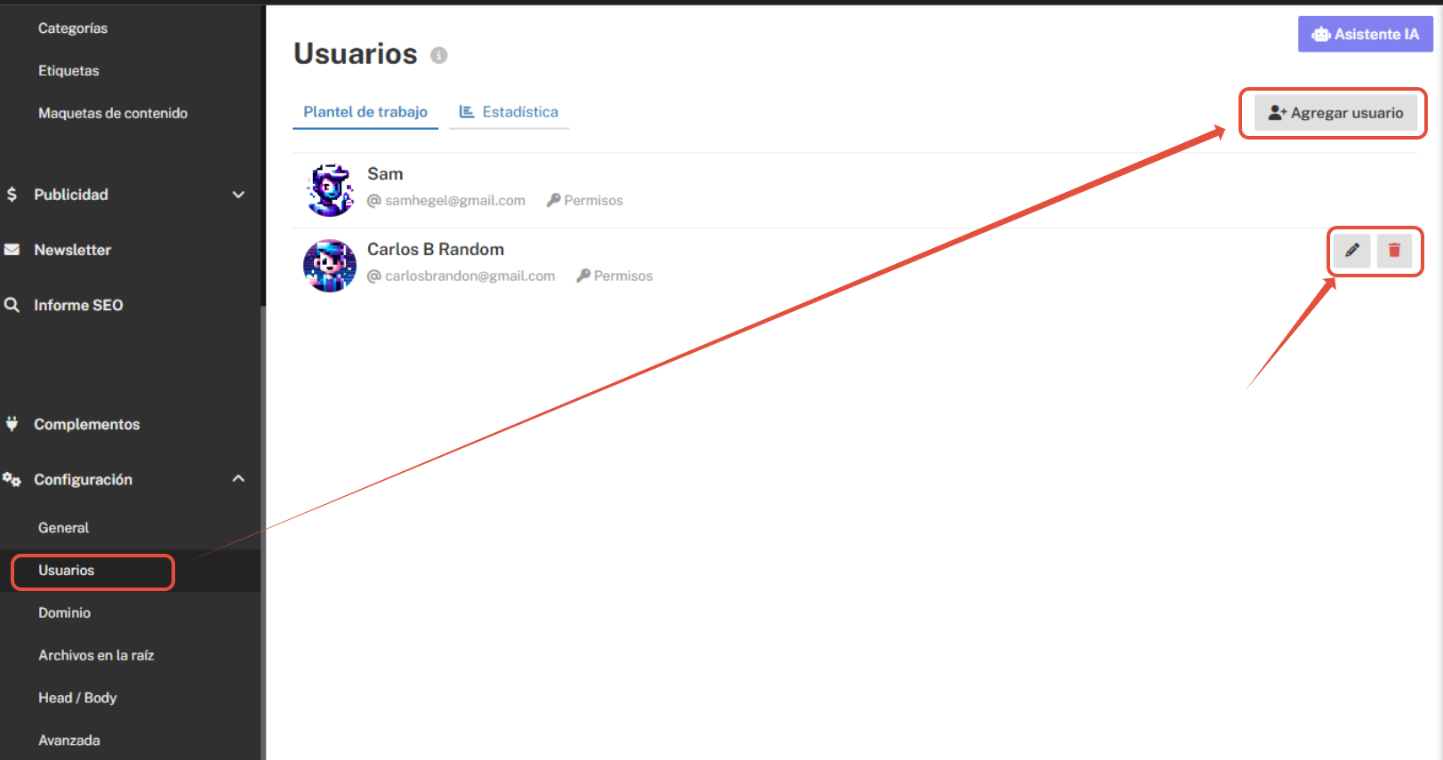 - Quitar un usuario: En la misma sección de Usuarios verás la lista de personas que conforman tu equipo. Simplemente haz clic en el icono con forma de tachito de basura junto a su nombre. El acceso se revocará de inmediato, pero sus artículos publicados permanecerán visibles en el sitio bajo su nombre de autor para preservar el historial editorial.