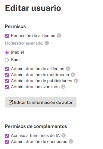 Cada colaborador tiene una ficha de autor que enriquece la transparencia del medio. Desde Usuarios > Editar > Información de autor, puedes configurar:
