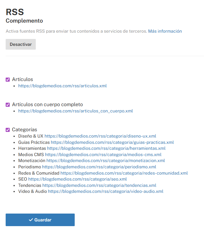 En Medios CMS, puedes gestionar las fuentes RSS de tu sitio de forma sencilla. Las fuentes RSS son un formato estándar y público que permite distribuir contenidos de manera automatizada, como publicaciones en redes sociales o inclusión en otros sitios web.