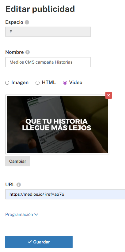 Disponibilidad: Esta función depende de tu plan actual; puedes verificar si tienes acceso a "Video Ads" en la tabla de planes: https://medios.io/precios
